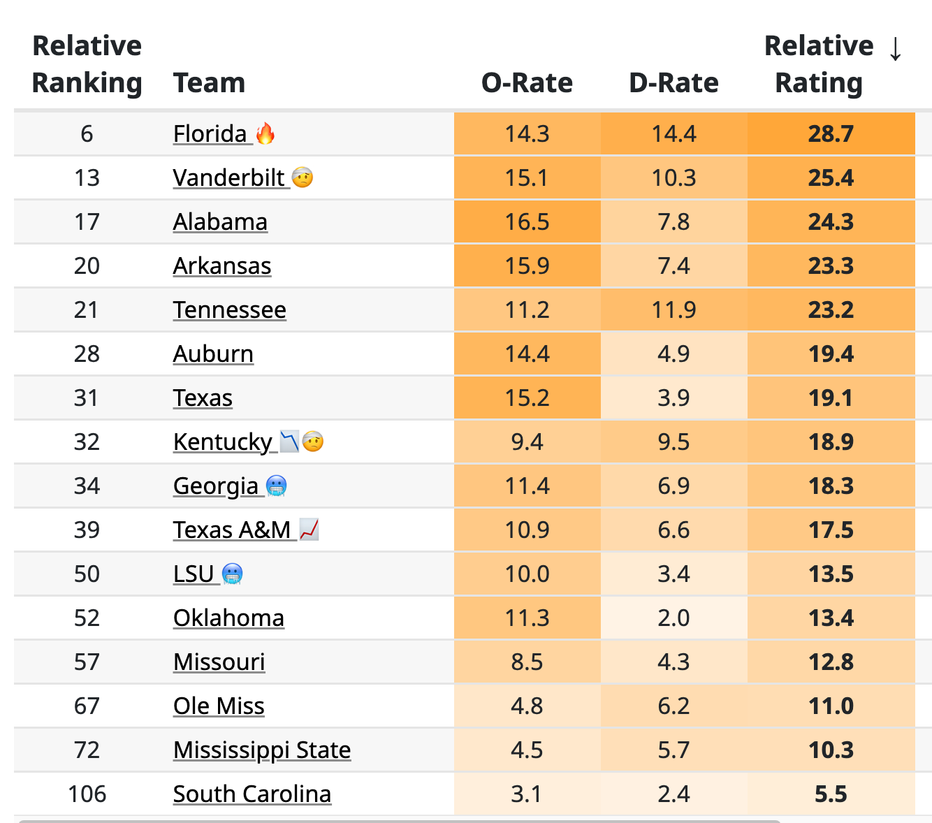 The SEC had a historically strong 2025, leading to what many consider the best single season in conference history. They had 14 of their 16 teams make the NCAA tournament, setting a record for the most from a single conference. They also finished the season with four of the top six teams in the nation at EvanMiya.com, including the national champions in Florida.