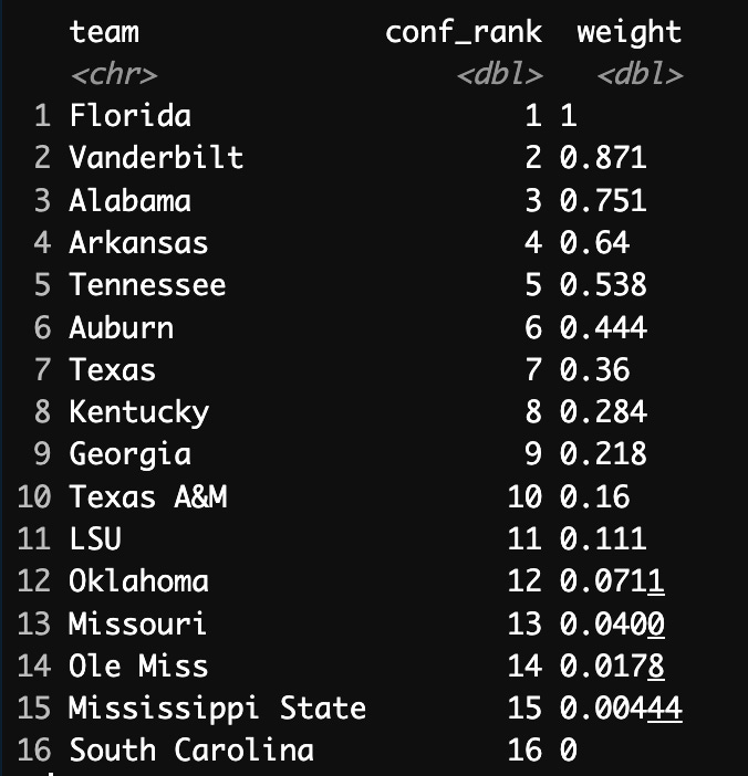 This exponential weighting system assigns significantly more weight to teams ranked higher in the conference, with diminishing weight for teams in the middle and lower tiers. The table below shows how this works for the SEC conference. A team ranked in the dead middle of a conference will have about 25% of the weight of the best team in the conference.