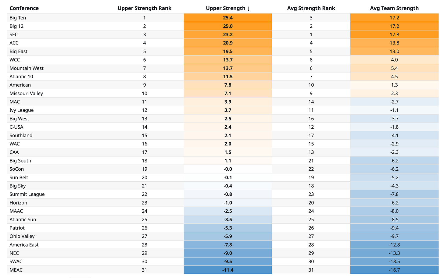 To better measure the top-end quality of each conference, I have created a new conference strength metric, which you can find updated daily on EvanMiya.com's “Misc” page. I’m calling it “Upper Strength” to represent the team quality in the upper regions of each conference. I’ll share the exact details of how this is calculated in the footnotes1, but essentially, teams at the top of the conference are weighted much more heavily than those at the bottom.