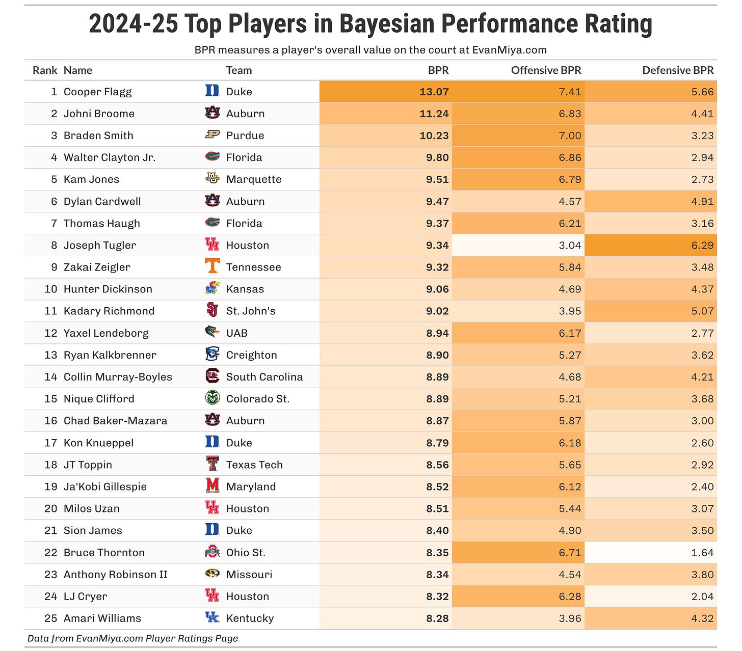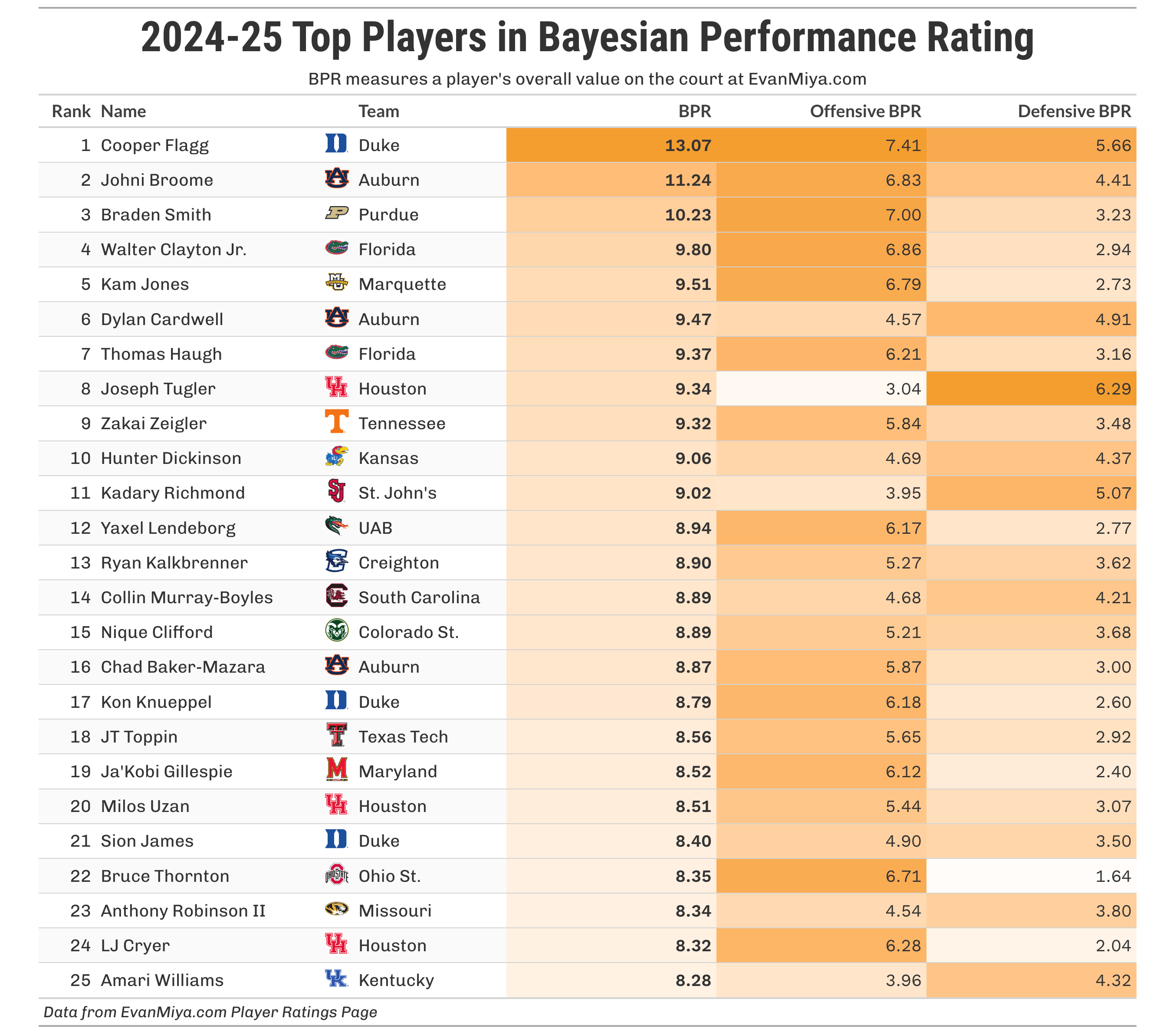 Enough technical details, let’s look at some numbers! The table below shows the top 25 players in BPR at the end of the 2024-25 season. In the top four, Flagg and Broome were clearly the best two players all season, and Braden Smith and Walter Clayton were consensus first-team All-Americans.