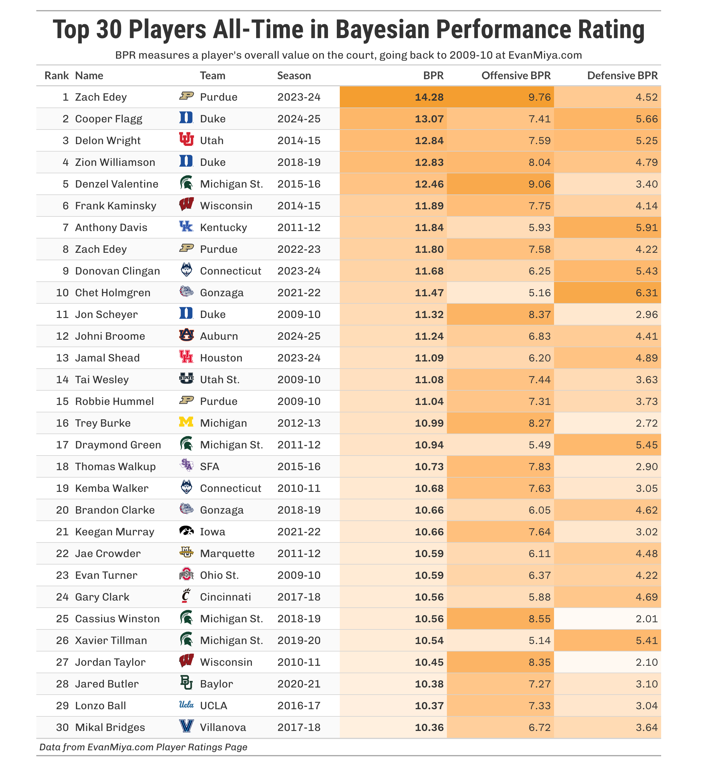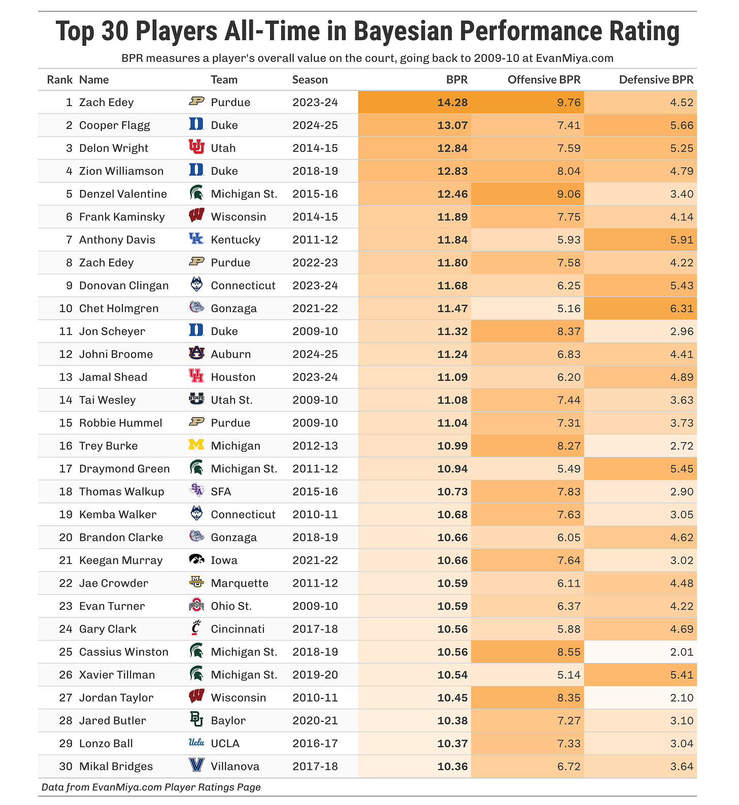 You can find the ratings for every other season on the Player Ratings page at EvanMiya.com, but I did want to take a look at the top 30 players all-time in BPR, going all the way back to 2009-10: