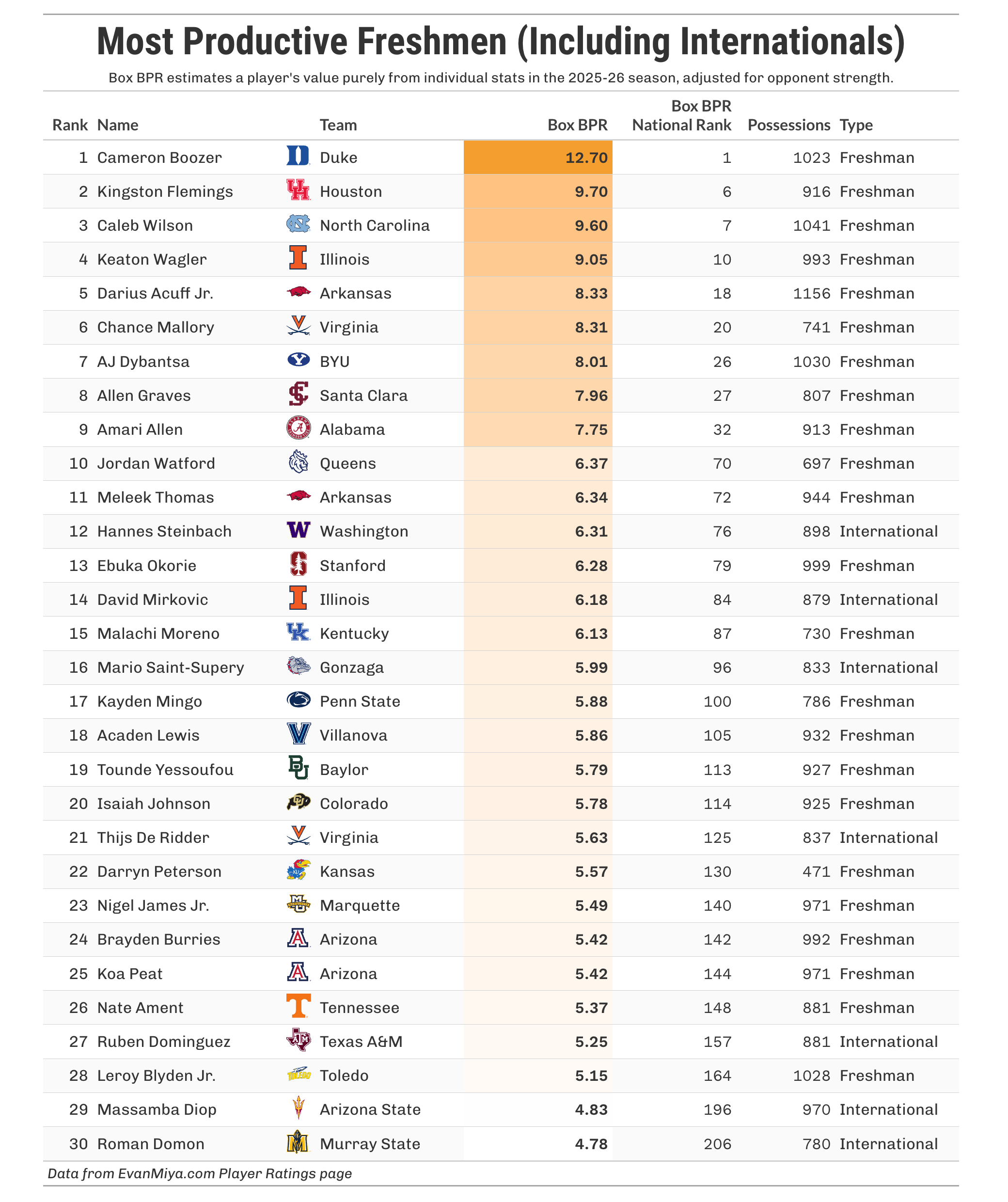 The table below ranks the top 30 first-year players in college basketball according to Box BPR. The ten most productive first-years are all traditional freshmen, but seven of them were international recruits this offseason.