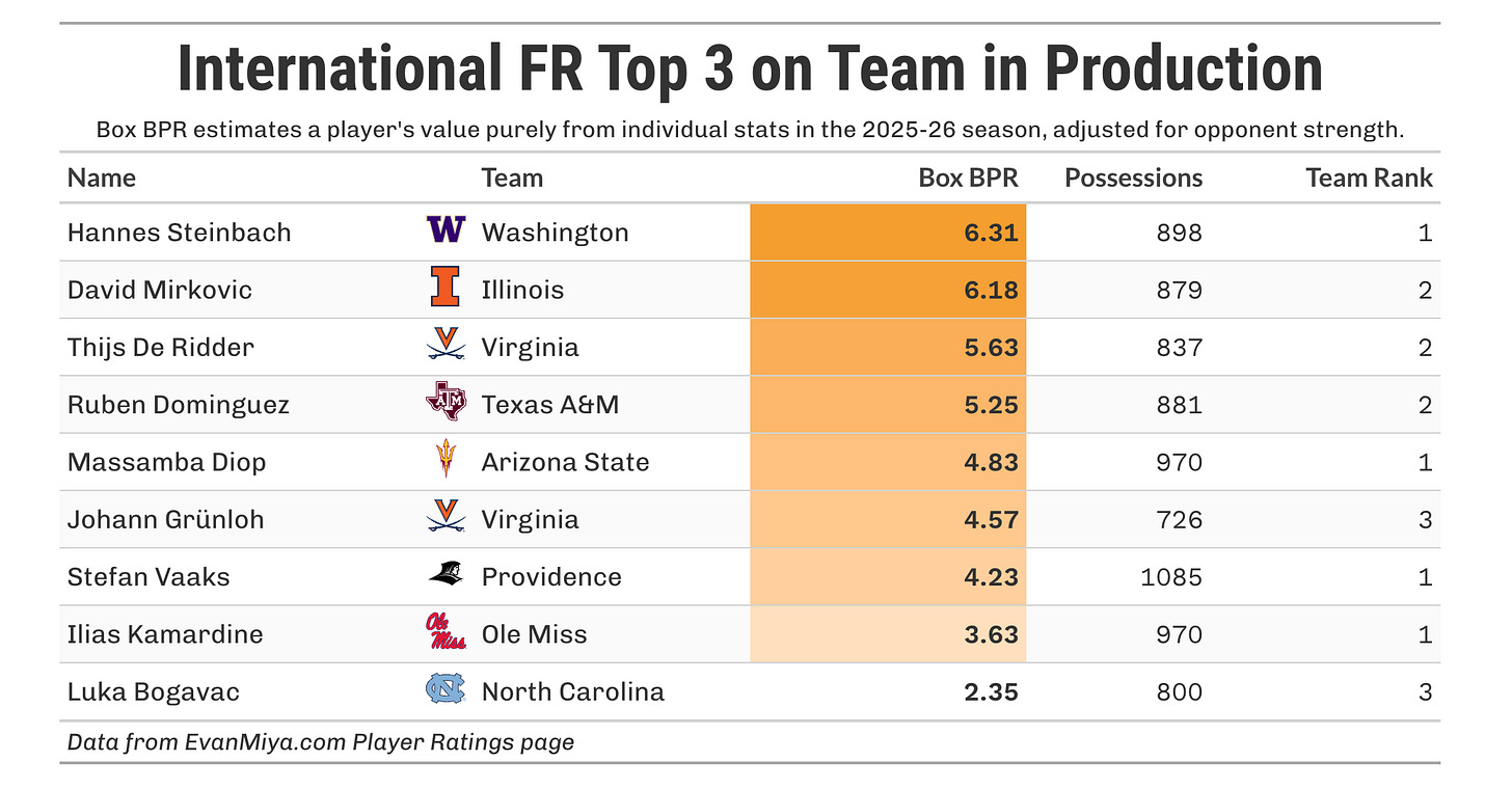 In comparison, there are just nine international first-years who rank in the top three on their own team in production among the big five conferences. By my count, that means 31 other internationals are playing for high majors that have not moved the needle on a national level in a significant way.