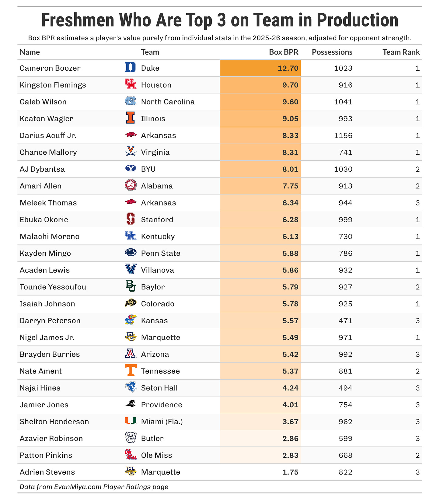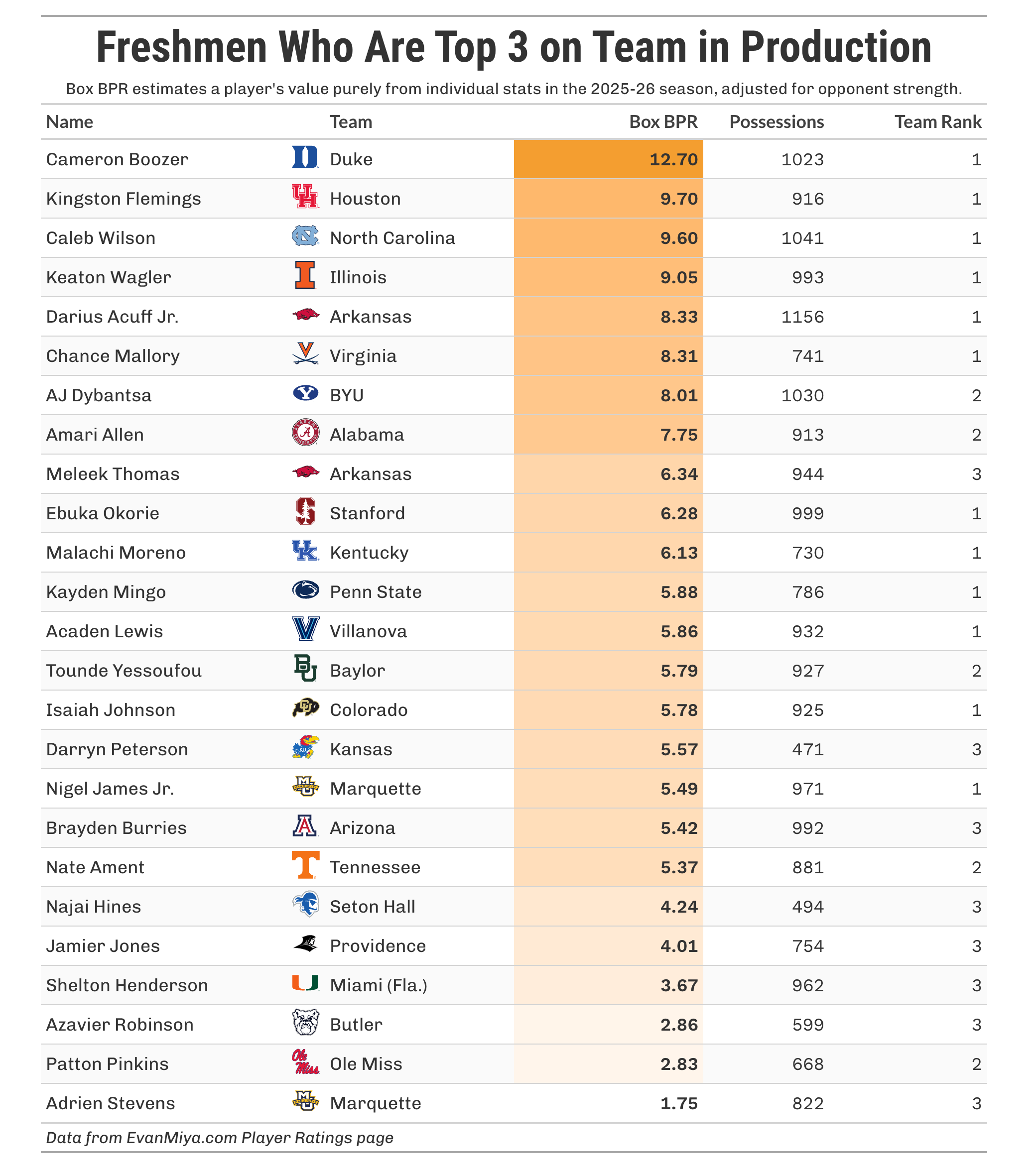 If you take the top three most productive players on each power-conference team this season, according to Box BPR, there are 25 traditional freshmen on that list. This means that 25 traditional freshmen are a major driving force behind their team’s success this season. The list of those freshmen is below: