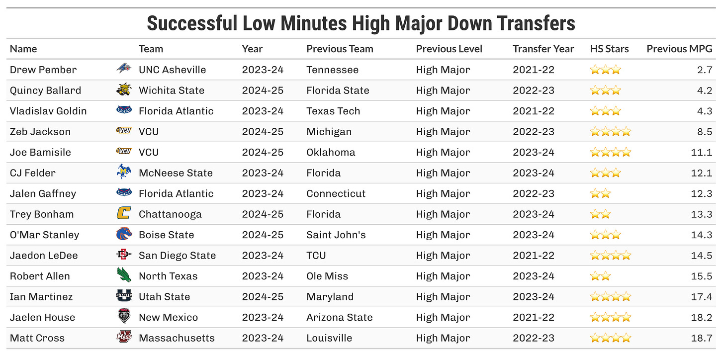 Additionally, many of the best high-major to mid-major transfers fit a particular mold: They were 3 or 4-star recruits out of high school who didn’t find consistent playing time. Of the 13 successful high-major transfers in the previous table, only 2 were 3-stars or better coming out of high school.