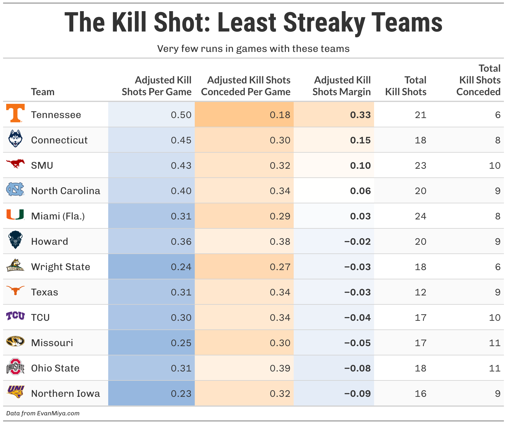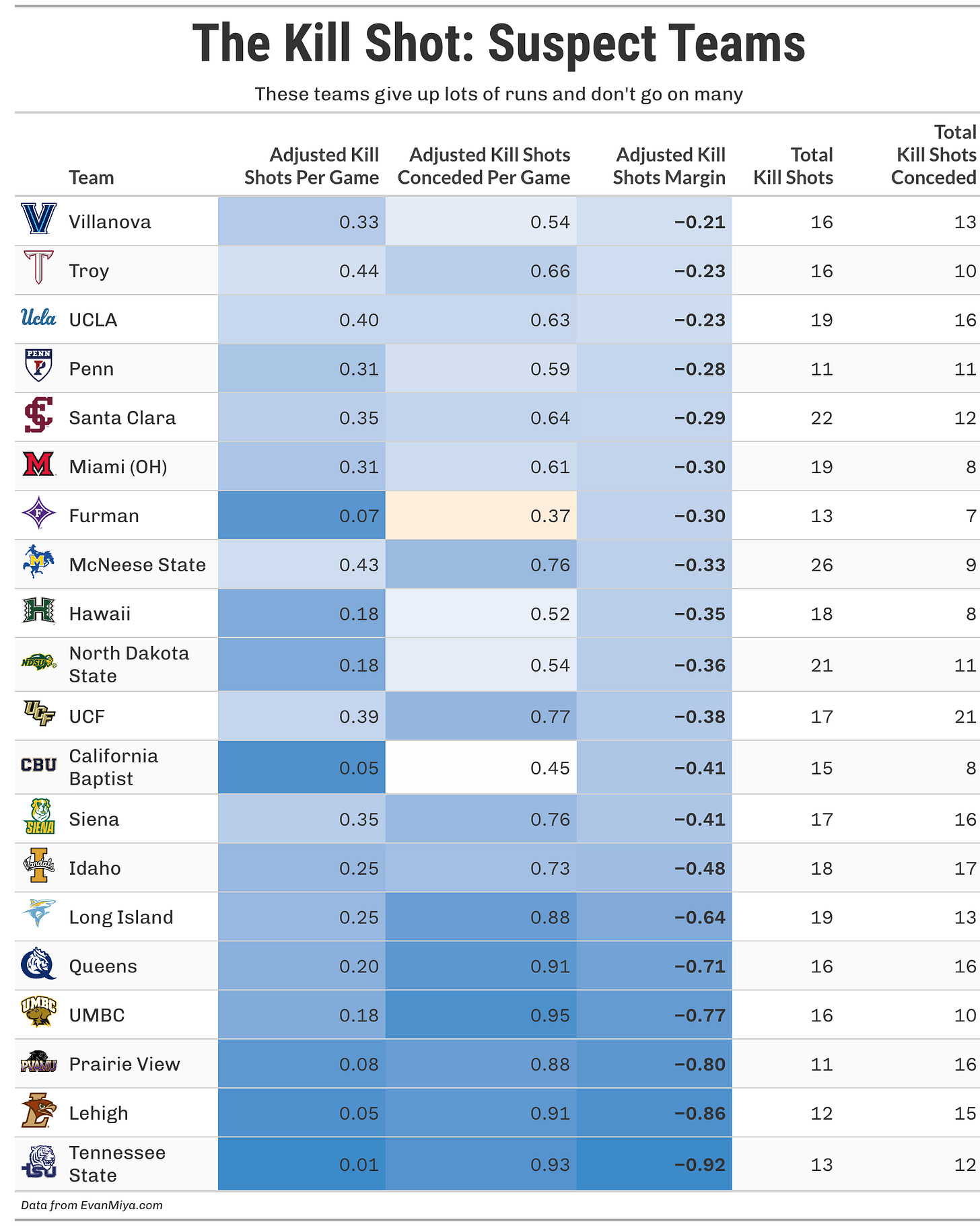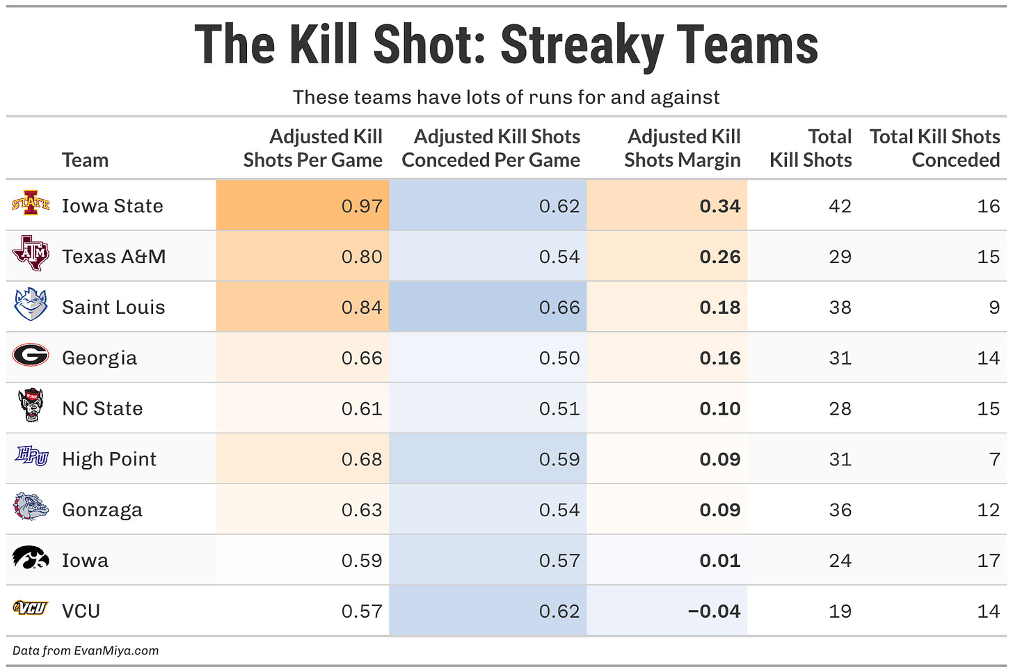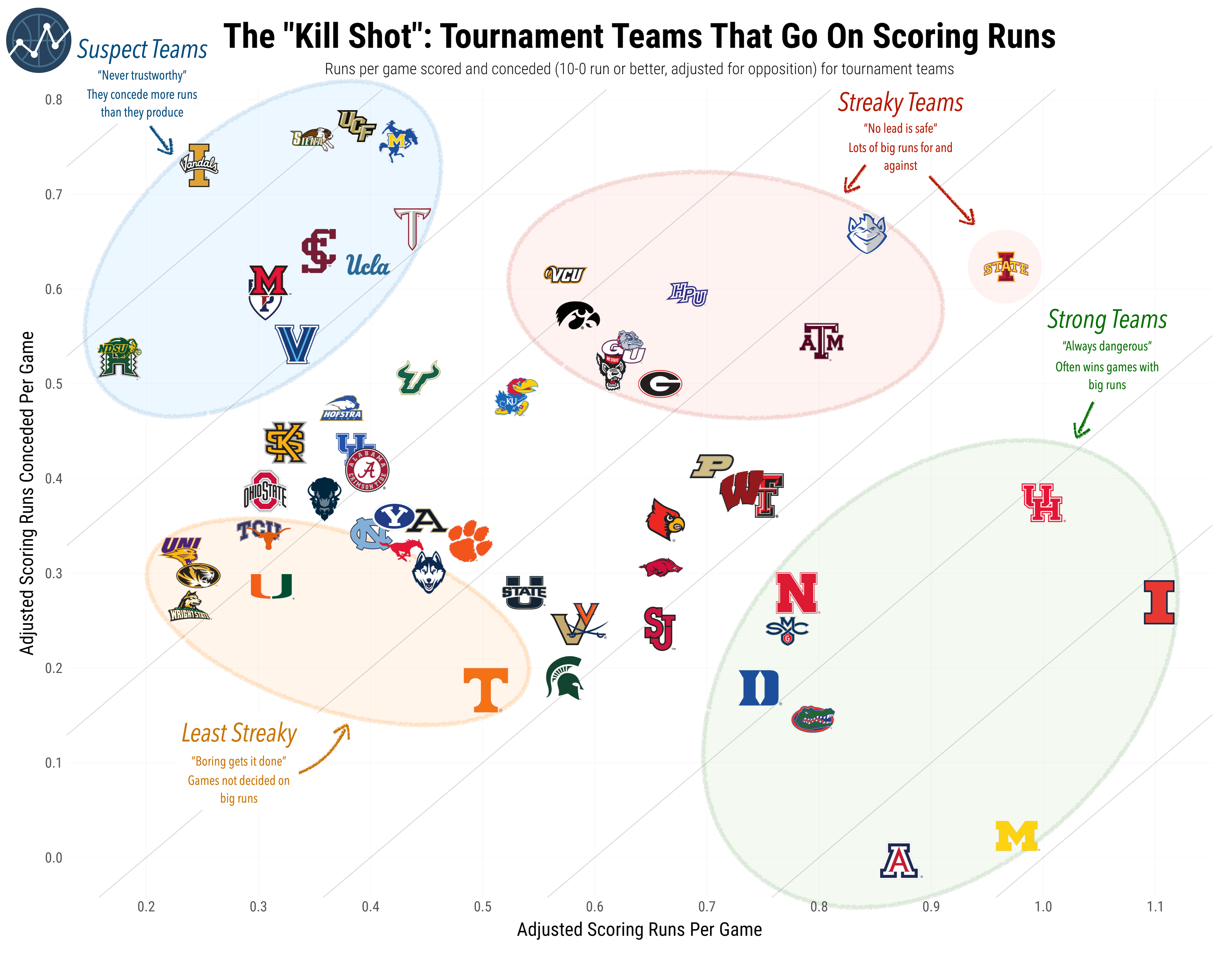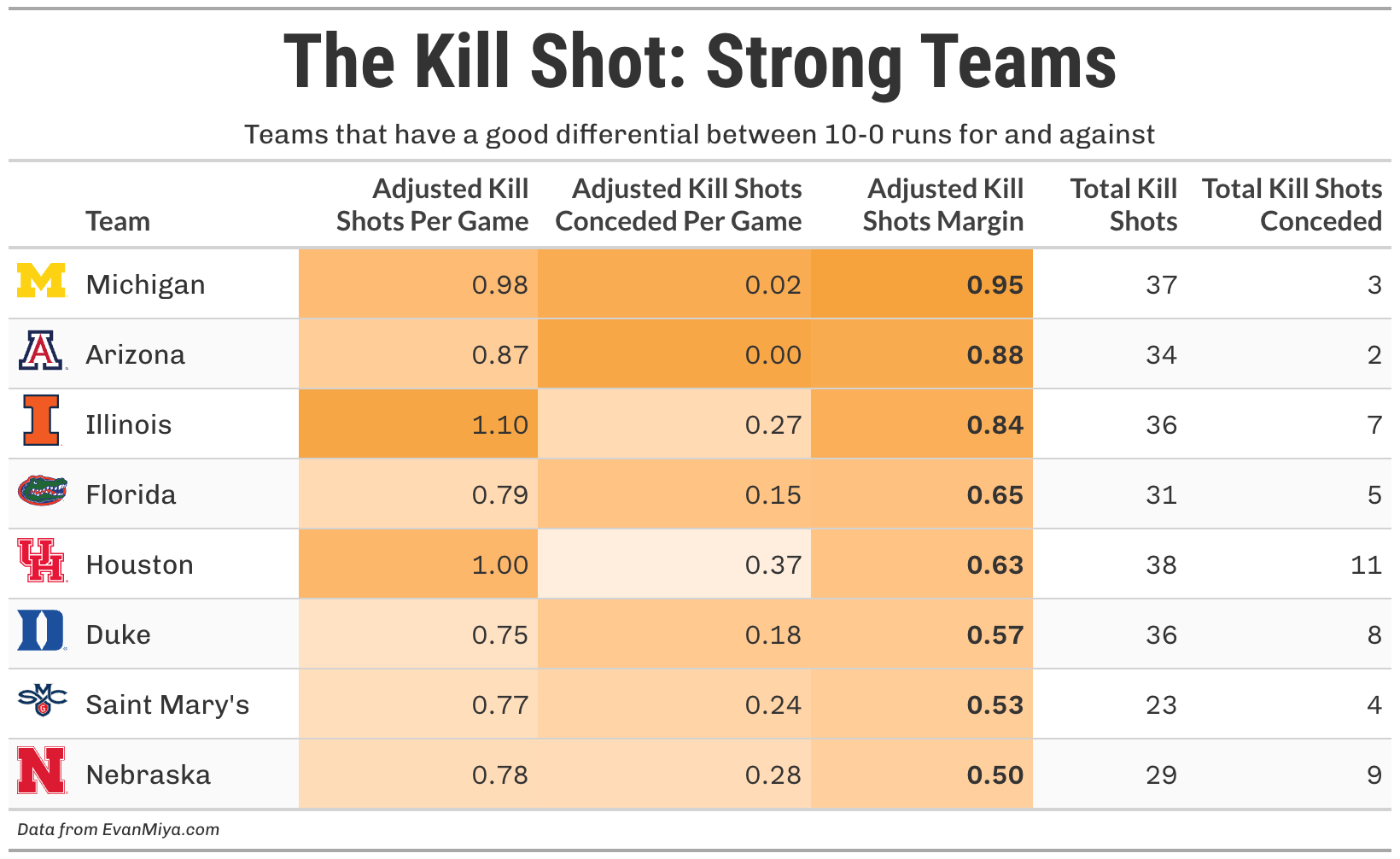 Illinois has the best adjusted Kill Shot rating of any team, meaning that they are more likely to generate a 10-0 run than any team in the field.