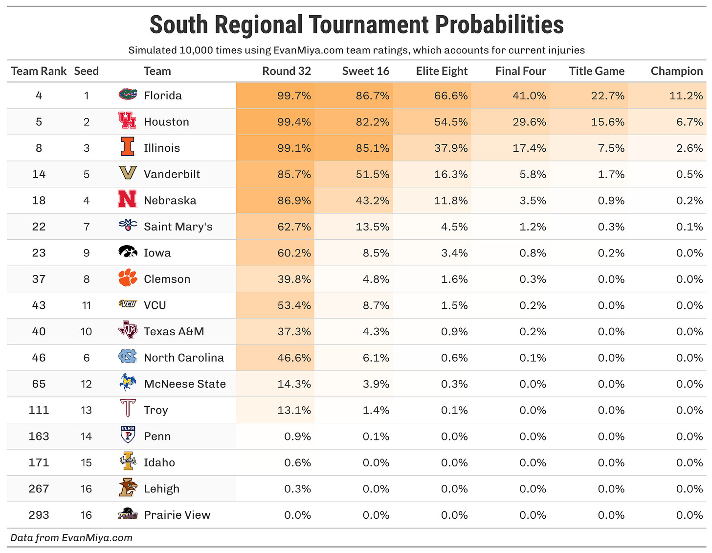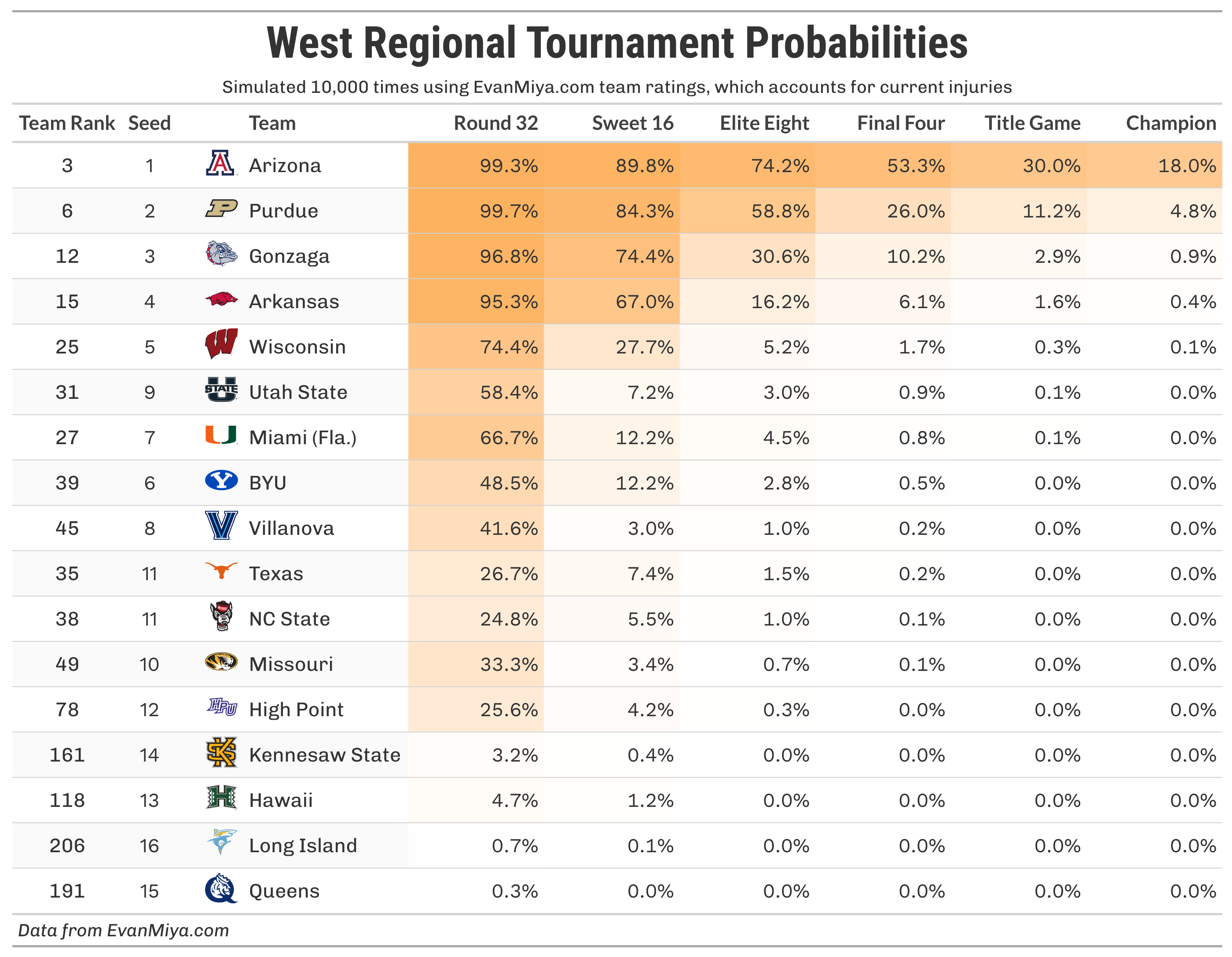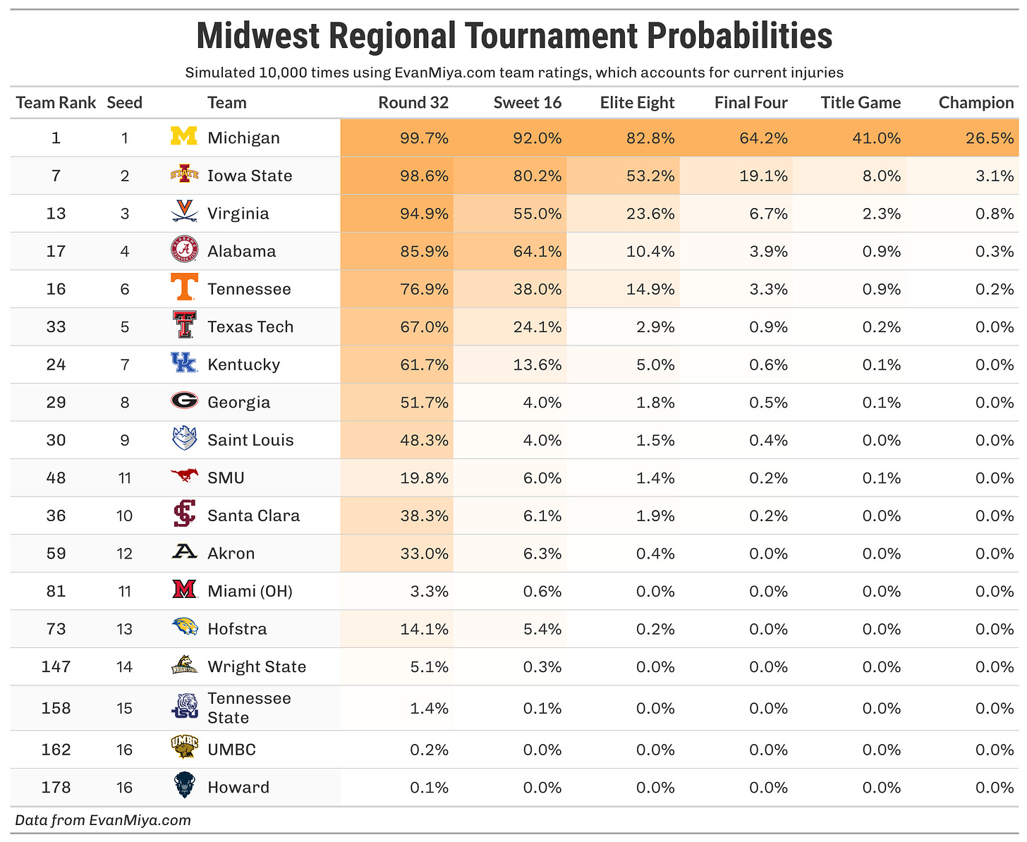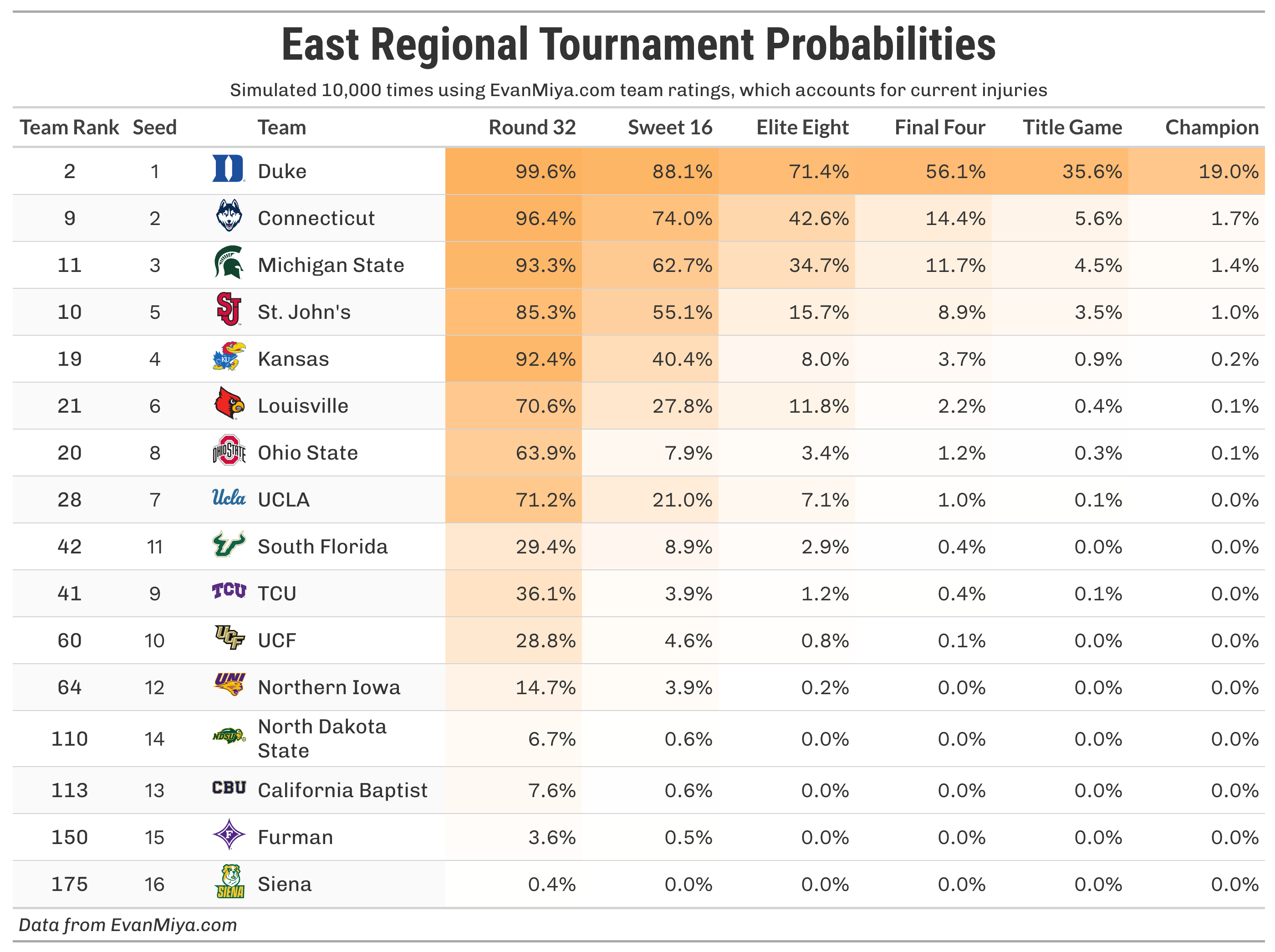 The tables below show each team’s chances of advancing to each round of the tournament, which you can also find at EvanMiya.com, updated daily as the tourney progresses.