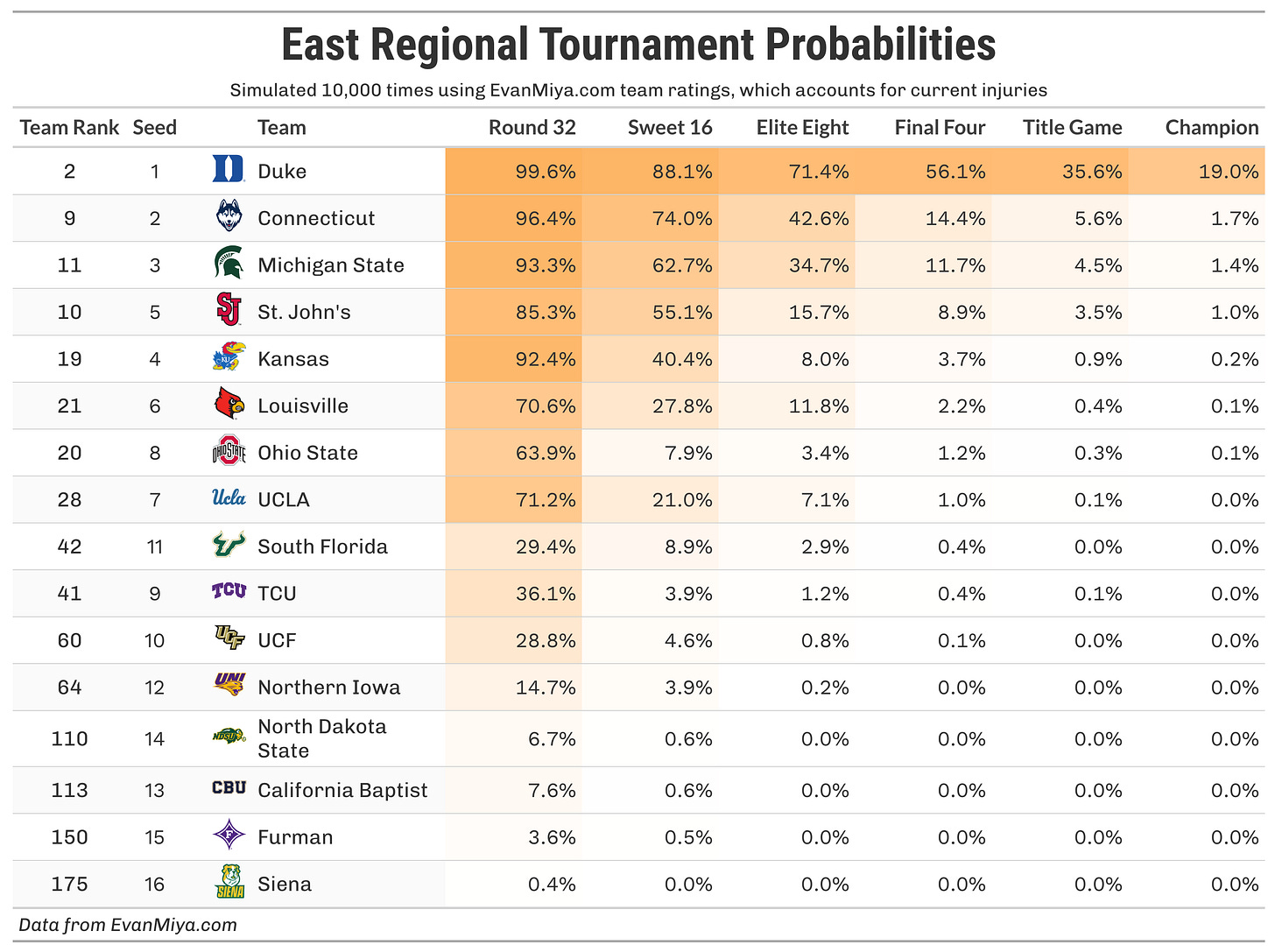 St. John’s has the best chances of advancing to the Final Four (8.9%) of any team not in the top three seed lines. If they advance past Northern Iowa, they would face the winner of Kansas/Cal Baptist, with a likely Sweet 16 matchup against Duke after that.