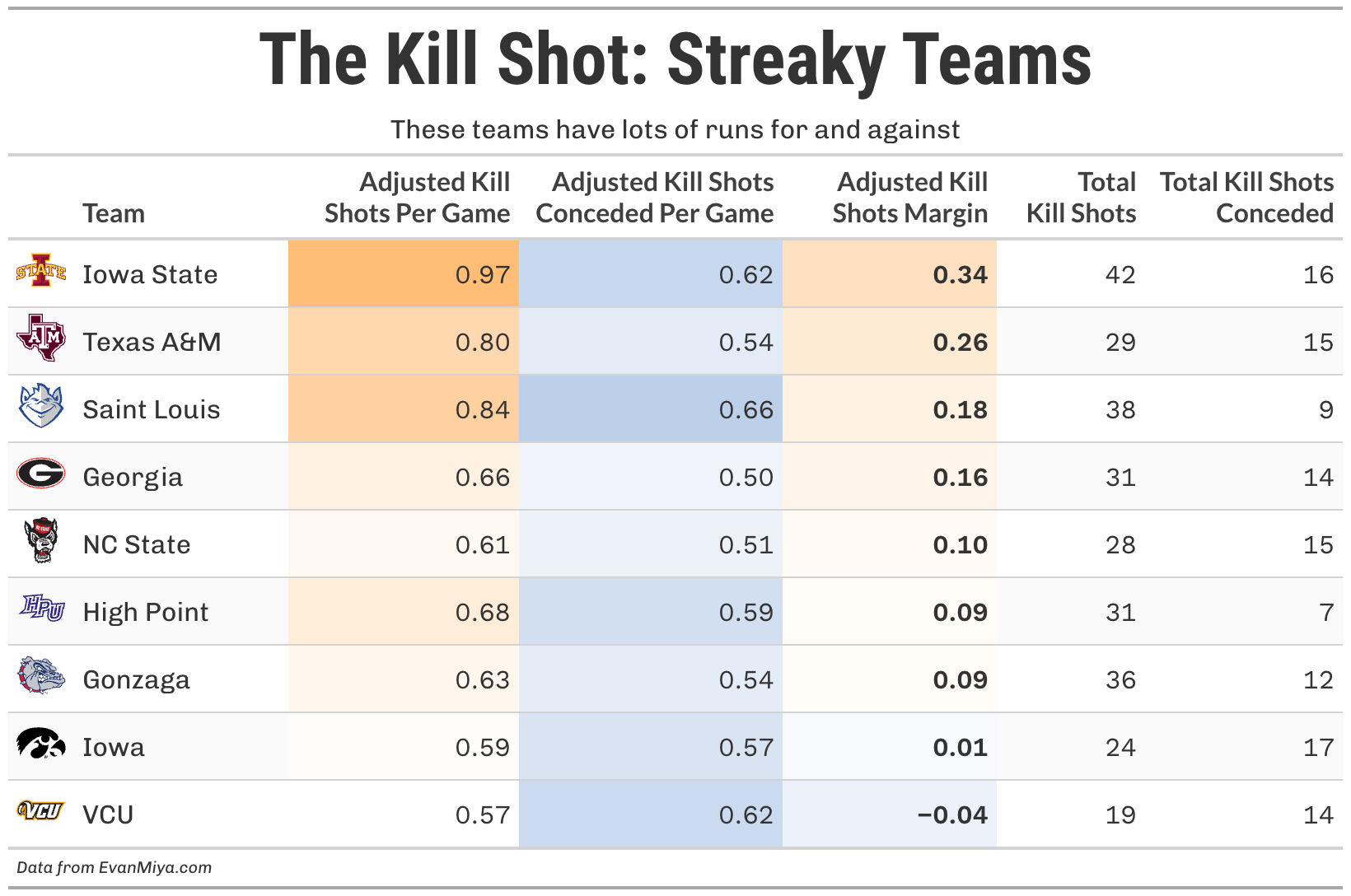 This wouldn’t be an EvanMiya.com article without analyzing the “Kill Shot”, any time a team scores 10 or more unanswered points in a game. Teams that go on many of these 10-0 scoring runs are more able to erase a deficit quickly and can also easily close the door on an opponent in a tight contest. Similarly, teams that limit opponents’ “Kill Shots” are more likely to hold on to a lead rather than allow another team back into the game.