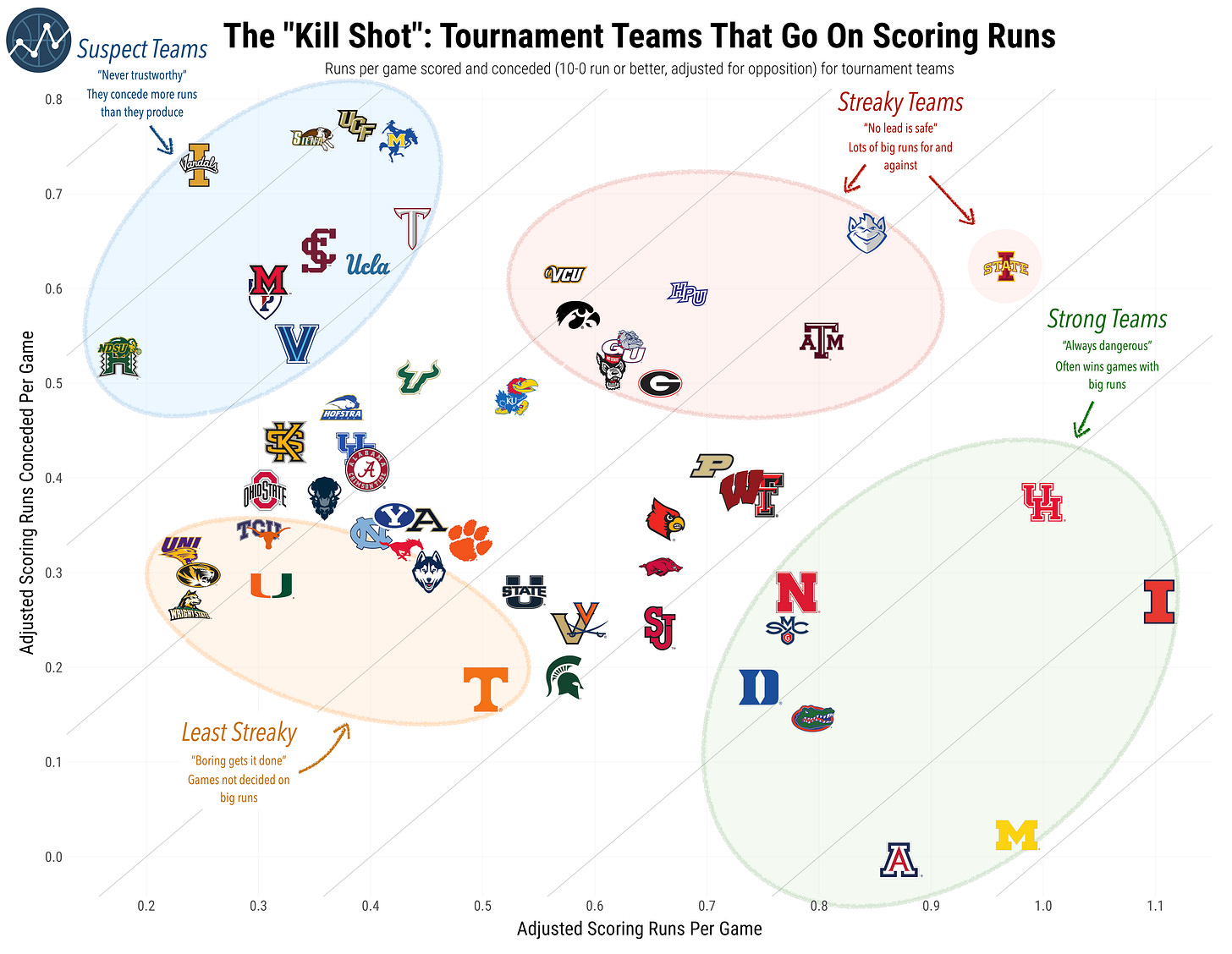 In general, I have found that preventing 10-0 runs is the more predictive stat of teams that advance the furthest in the tournament. While it’s great to be able to put up scoring runs in a hurry, the best teams are the ones who can hold a lead and not quickly allow an opponent back in the game.