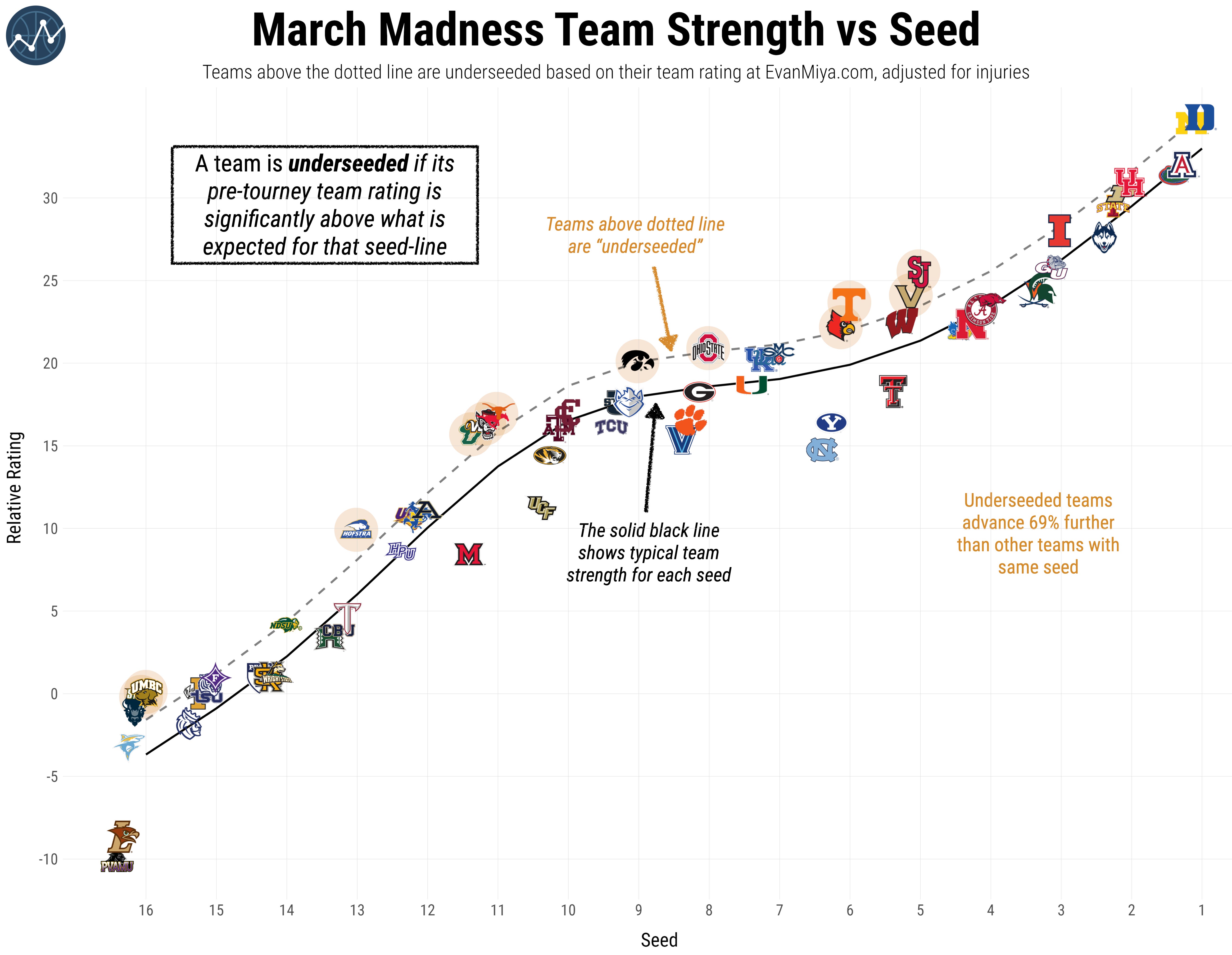 To better understand how these team ratings compare to each team’s seed, I present the graph below, which highlights teams that are much stronger or weaker than usual for their seed. This is really where we can find value in the predictive analytics. Teams highlighted in orange are considered “underseeded” and advance 69% further than other teams with the same seed.