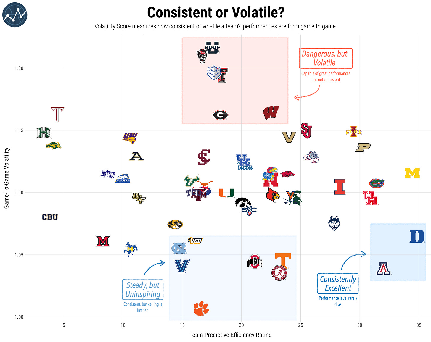 The most volatile teams in this tournament are Utah State, NC State, Saint Louis, Texas Tech, Georgia, and Wisconsin. They all have pretty big swings between their best performances and their worst. As an underdog, this is probably a good thing as it gives them a better chance of causing an upset if they are at their best. However, it does make them less reliable over multiple games to sustain a high performance level.