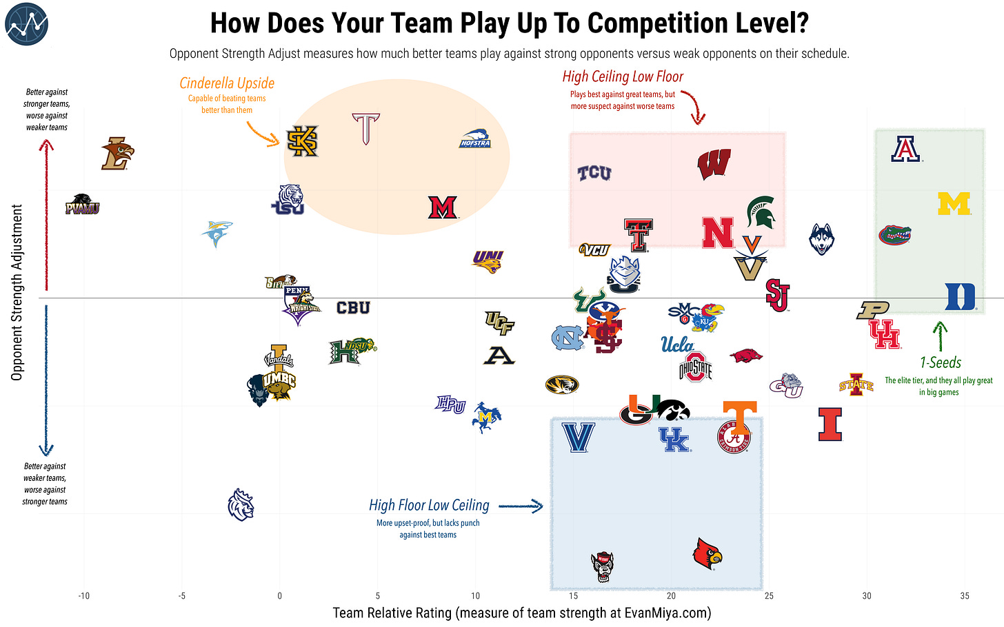 This is a new graphic this year that looks at how much better teams play in elite competition compared to when they play weaker teams on their schedule. The Opponent Strength Adjustment metric, which you can find on the Team Ratings page at EvanMiya.com, measures how well each team performs above or below expectations based on whether they are playing a really good opponent or a really bad opponent. Some teams perform better than usual when they face really tough opponents, but struggle to dismantle weaker opponents. This concept is sometimes referred to as “playing up/down to competition”. Other teams are the opposite: they can easily crush inferior opponents but are disappointing against higher-quality teams on their schedule. Each team has a variable that measures where they are on this spectrum of playing up or down to their competition.