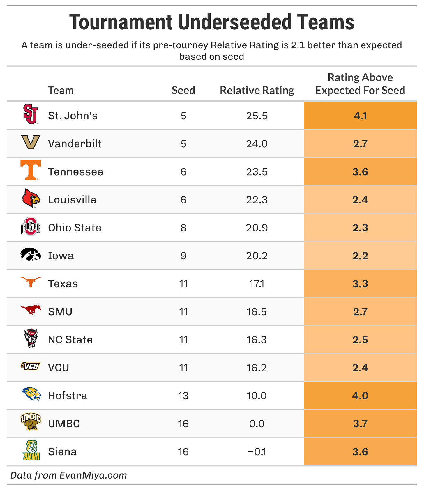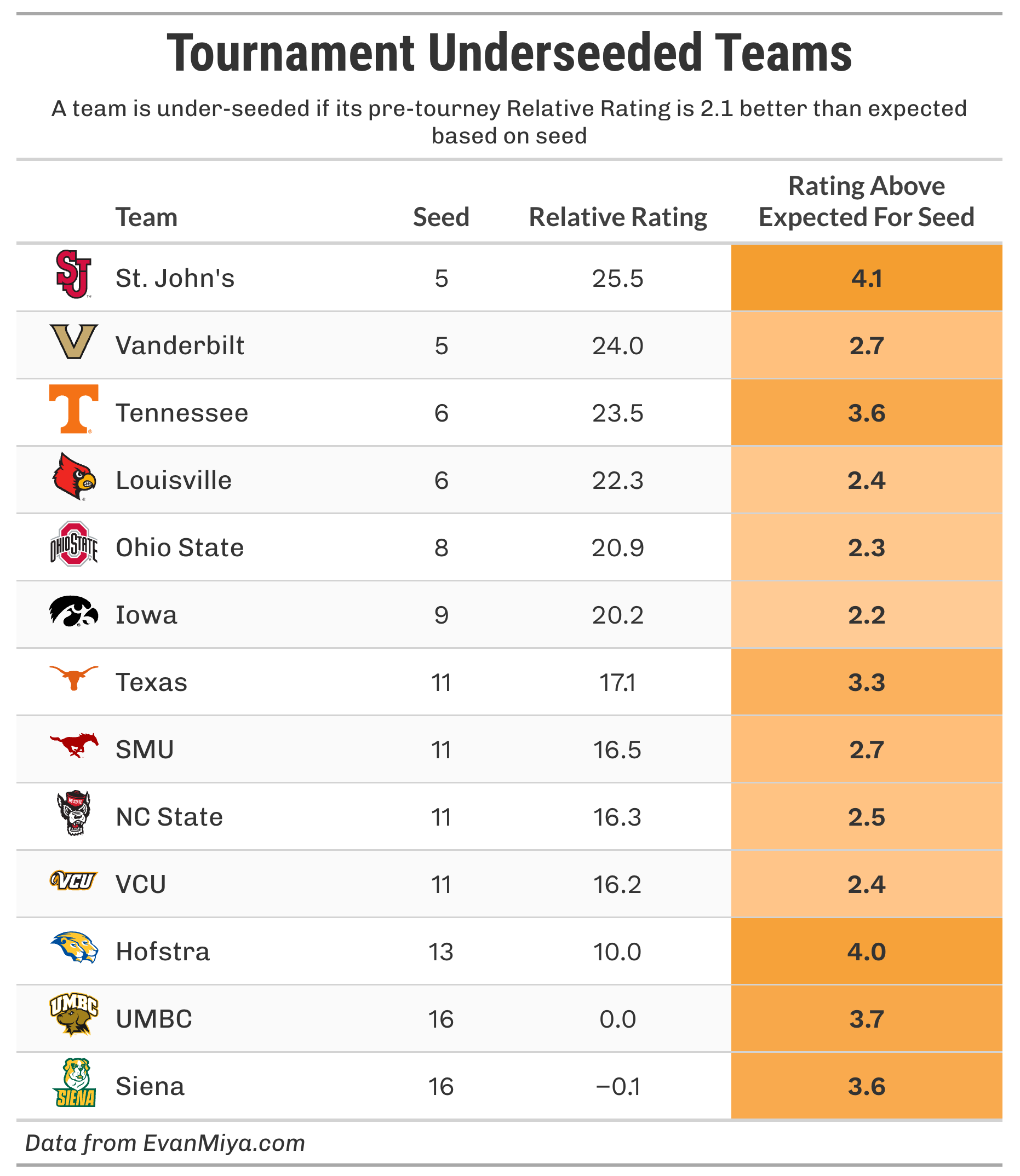 This year, 13 teams qualify as underseeded because they are much better than their seed would suggest. Of these teams, the ones that really stick out are 5-seed St. John’s, 6-seed Tennessee, 11-seed Texas, and 13-seed Hofstra, all of which have a predicted team strength much better than their seed.