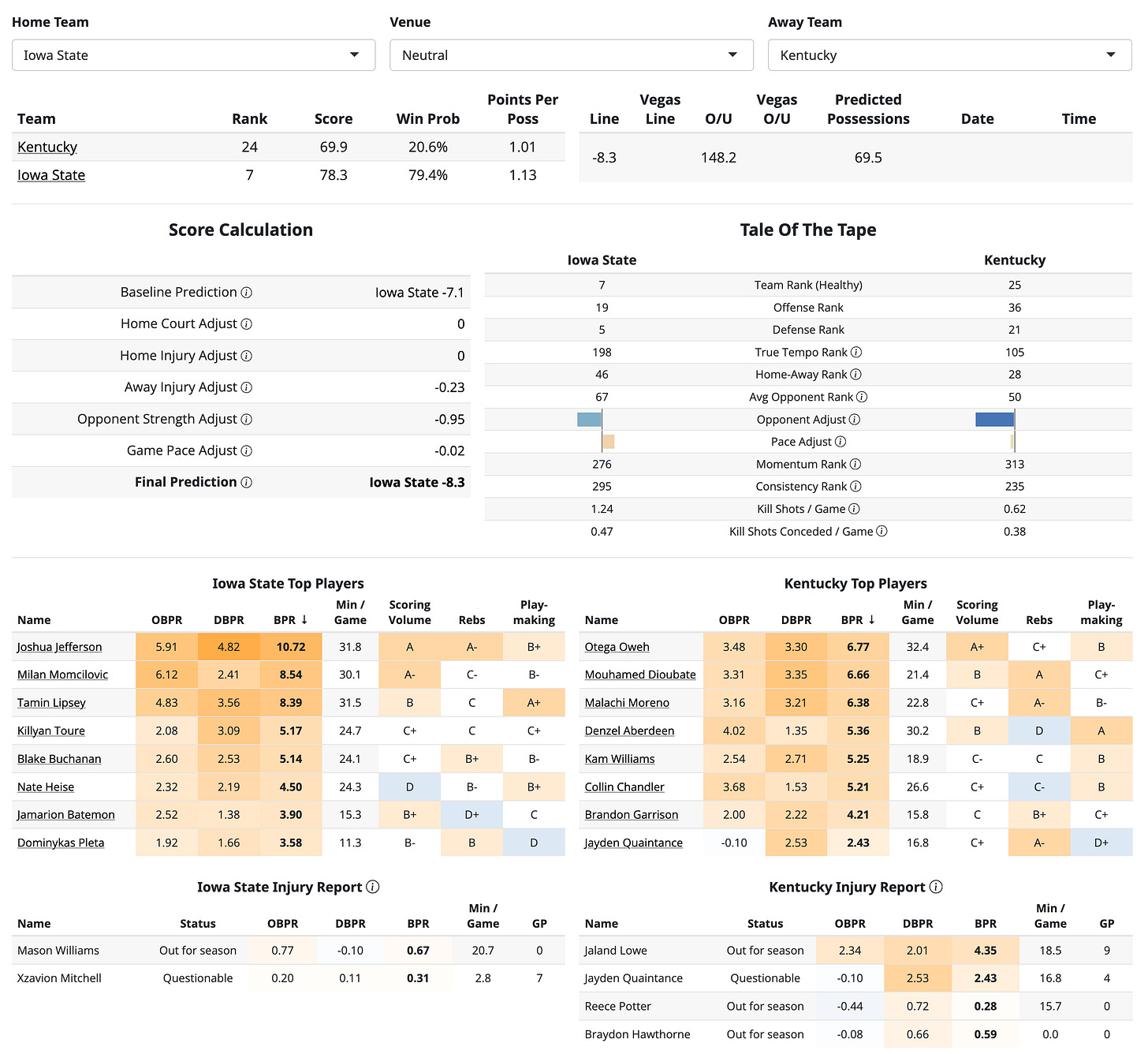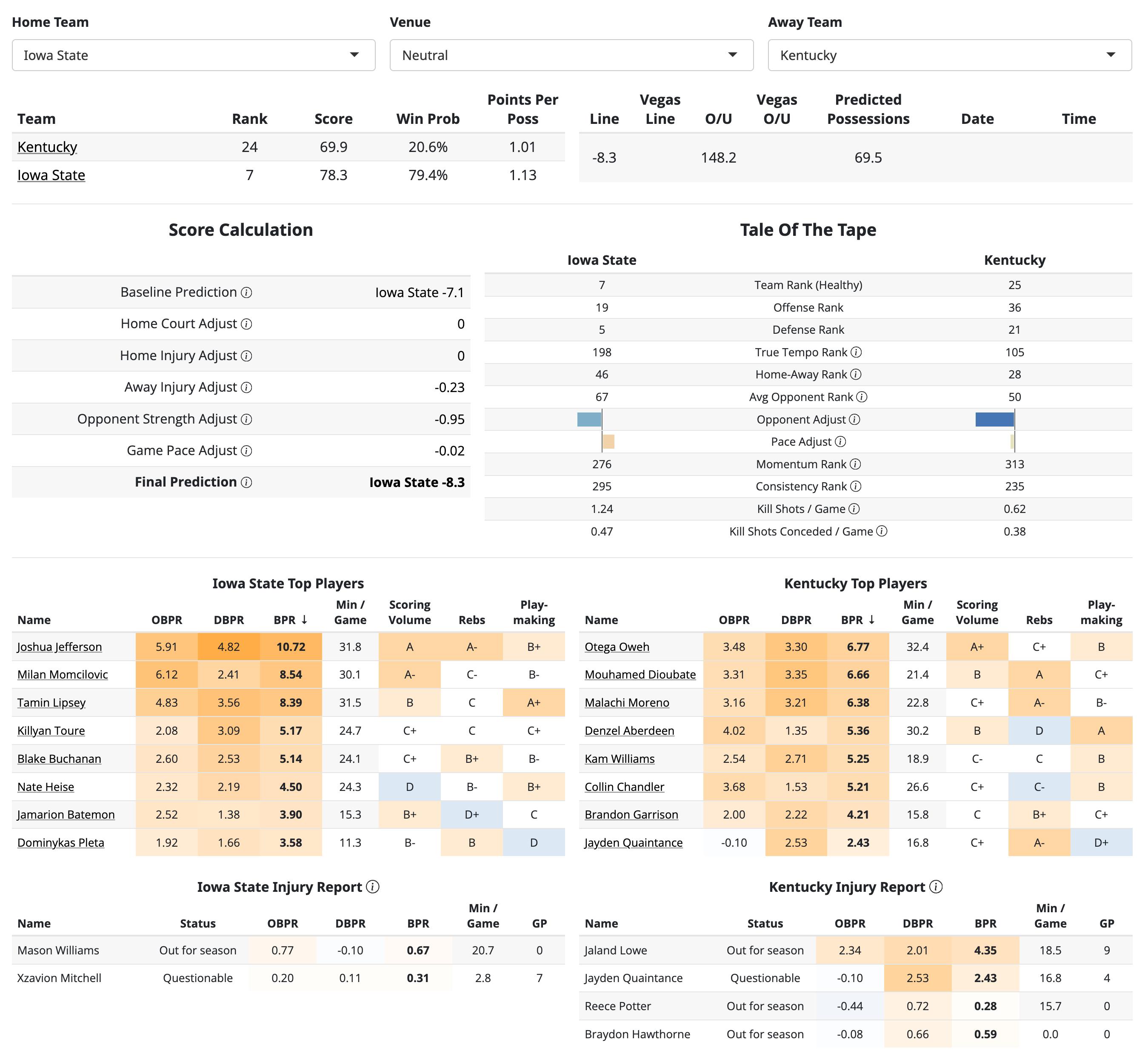 To dig more into the individual matchups, the Matchup Preview Tool at EvanMiya.com lets you analyze any hypothetical matchup in the tournament. It gives you score predictions, injury adjustments, other matchup-specific adjustments, a team comparison, a roster breakdown, and a daily updated injury report.