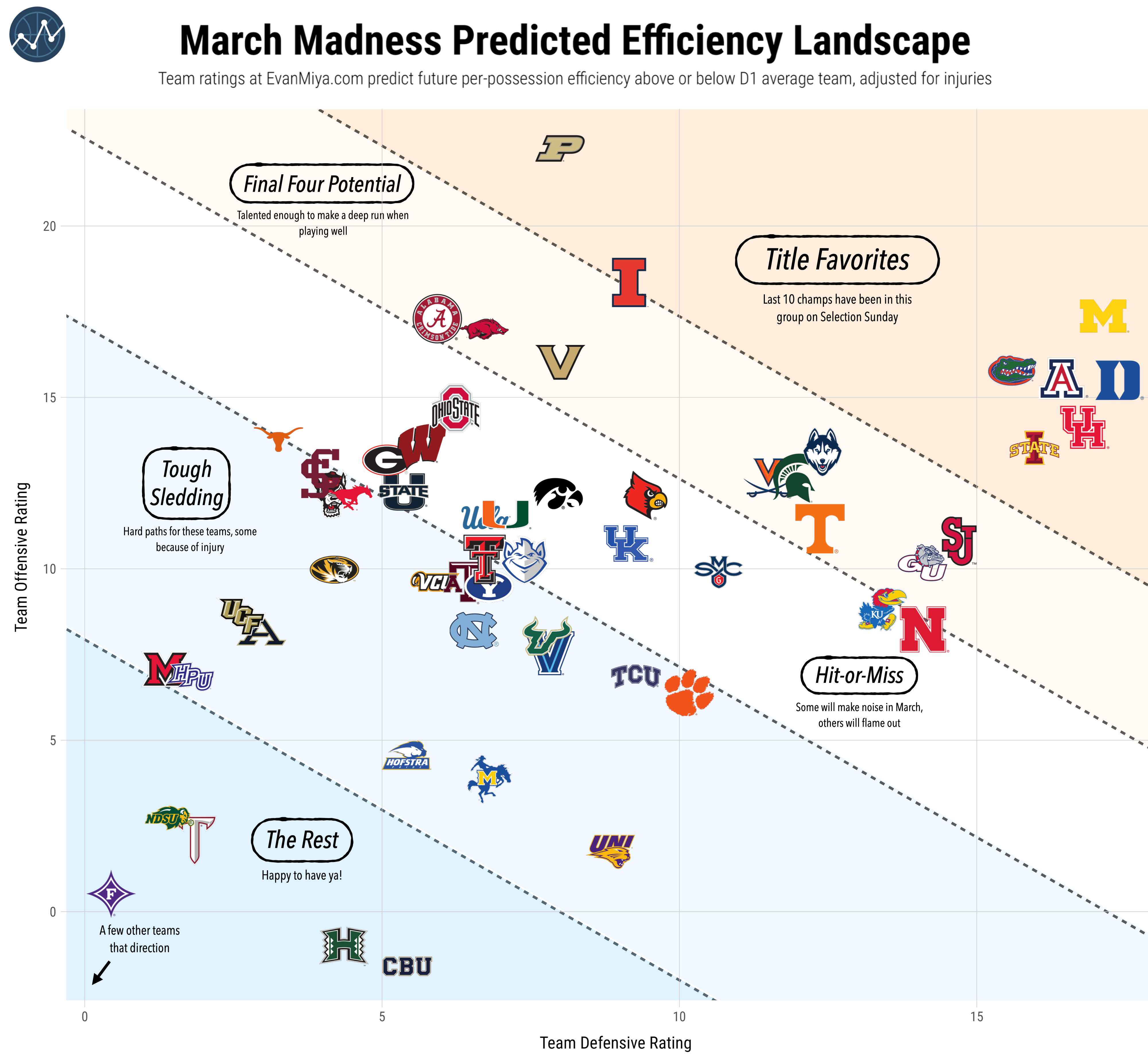 The graph below shows every team’s predicted offensive rating and defensive rating, with teams split into tiers based on their tournament potential: